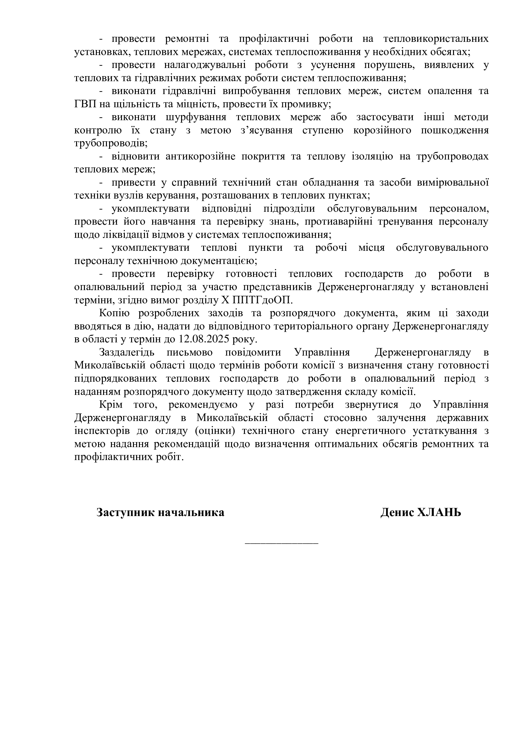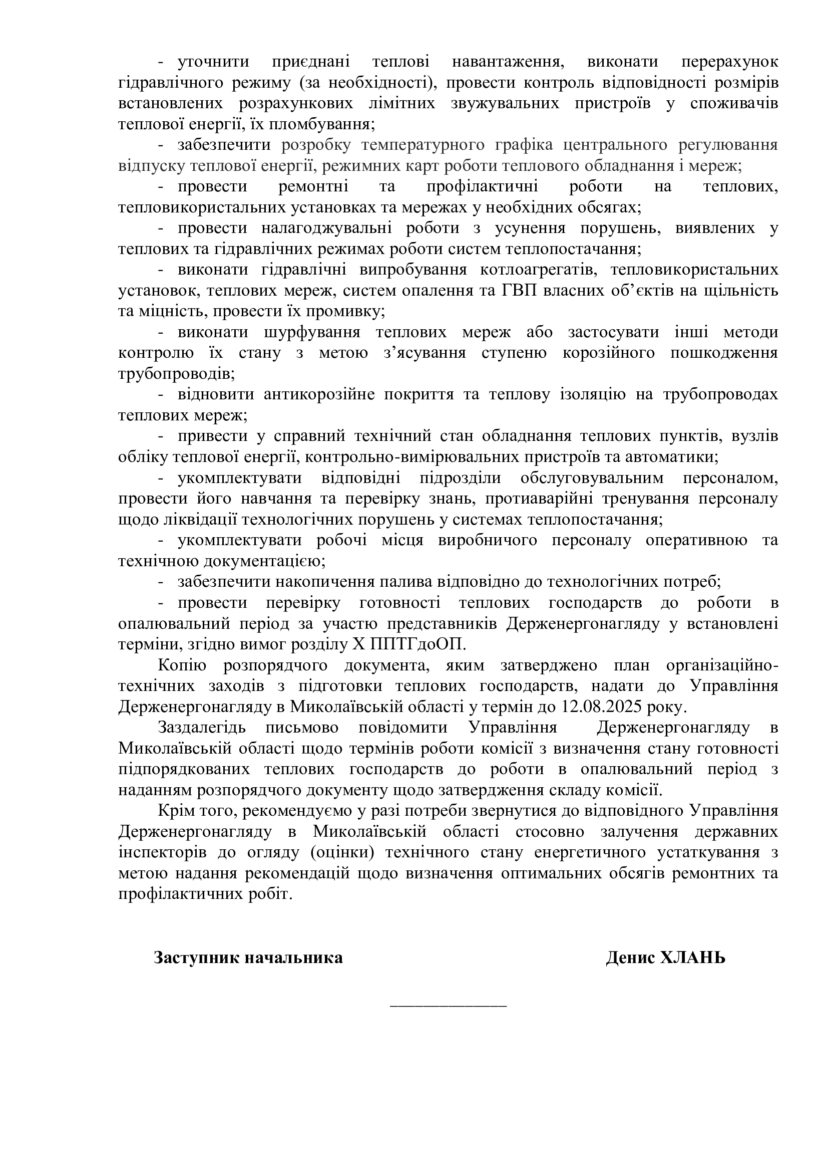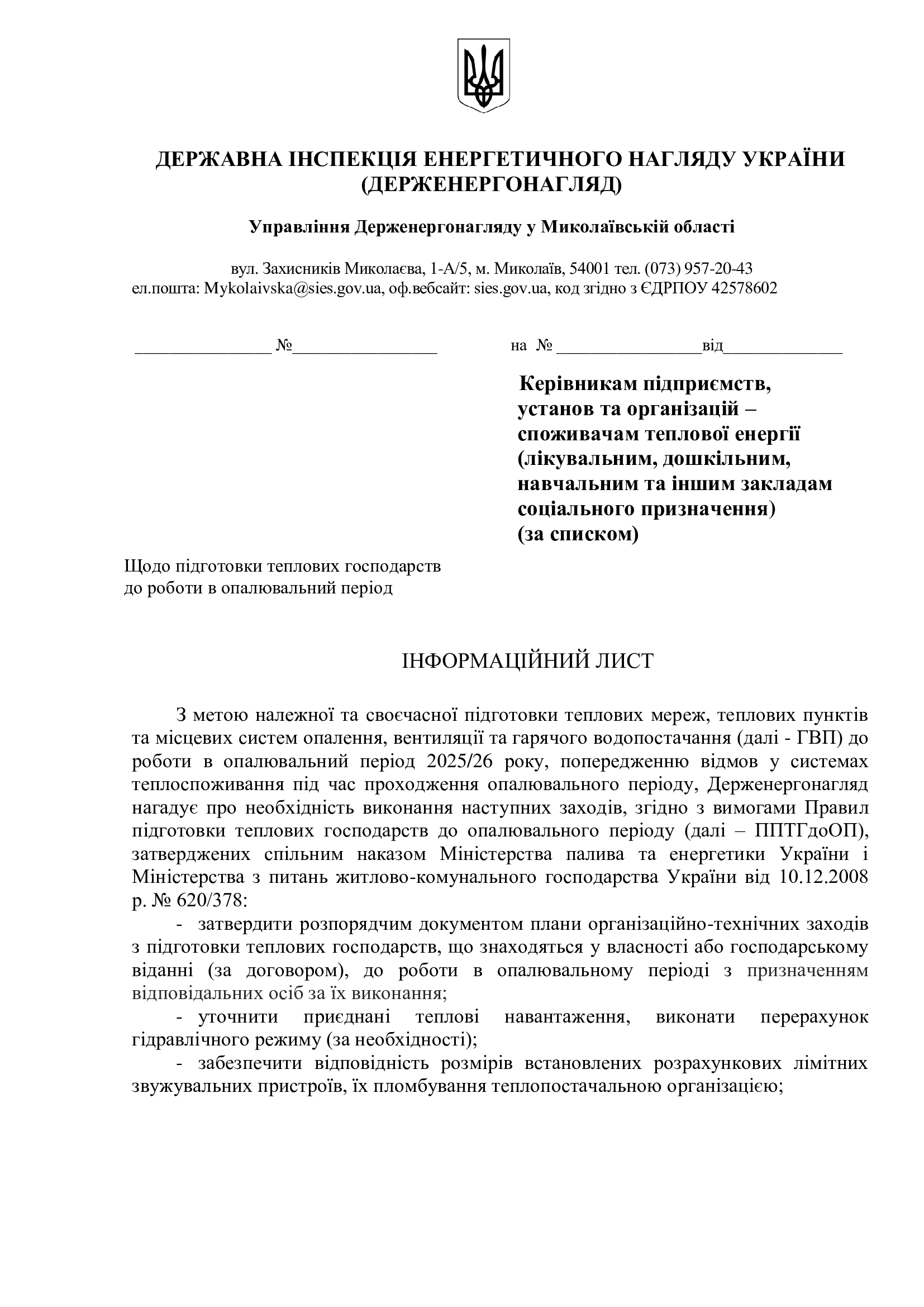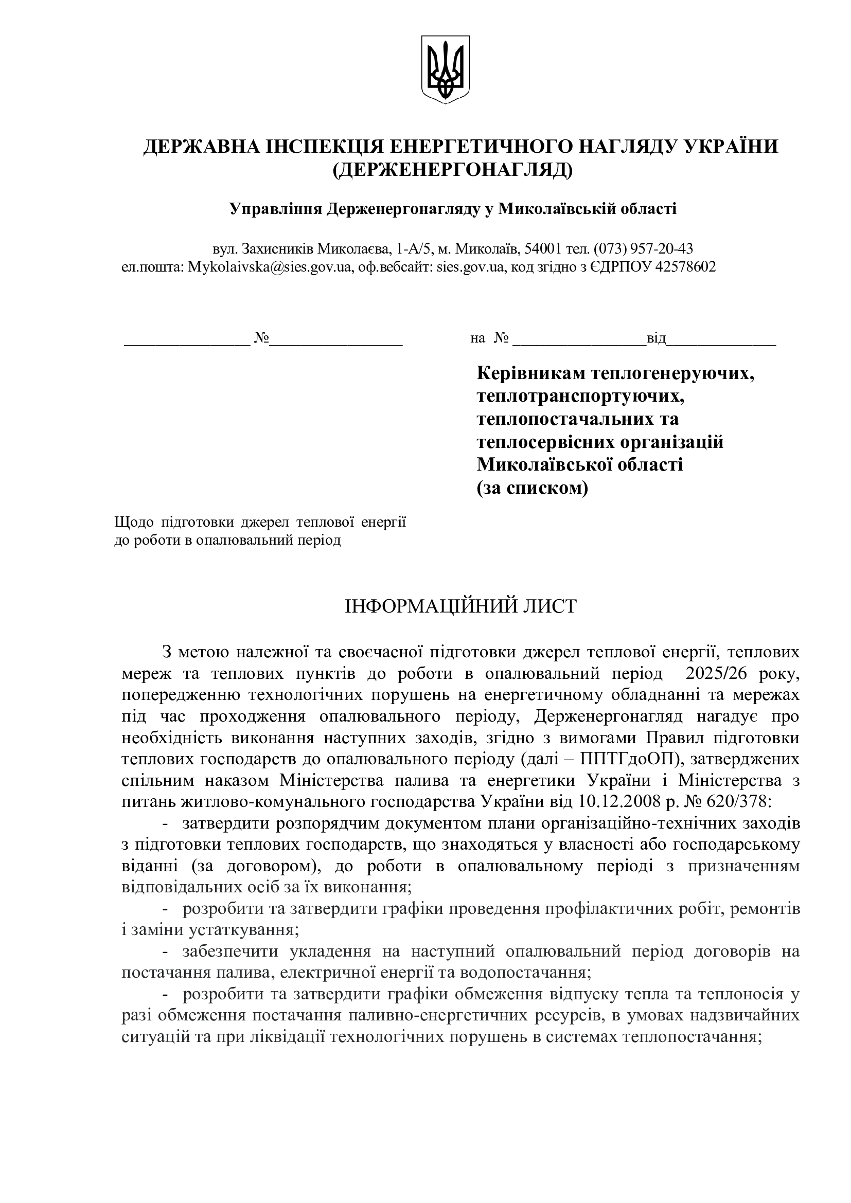 На виконання Окремого доручення першого заступника Міністра енергетики України від 27.06.2025 № 18/1.2-4.2-63, Доручення т.в.о. Голови Державної інспекції енергетичного нагляду України від 04.07.2025 № ДГ-21-25 та з метою своєчасної підготовки житлово-комунального господарства до роботи в осінньо-зимовий період 2025/26 року, Управління Держенергонагляду у Миколаївській області надало відповідні інформаційні листи: