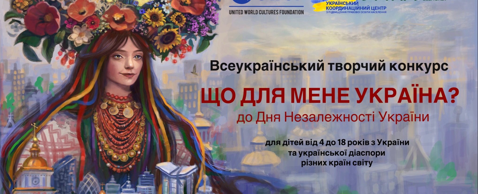 З метою культурно-освітнього розвитку, формування у дітей і підлітків національної ідентичності, патріотичного виховання; збереження культурної спадщини Українського народу; соціальної підтримки талановитої молоді, сприяння їхній самореалізації та творчому розвитку, активного залучення творчої молоді до соціально-вагомої діяльності; популяризації волонтерської діяльності дітей та підлітків в умовах воєнного стану, Благодійний фонд «Об’єднання світових культур» / United World Cultures Foundation / UWCF (основний організатор), Український координаційний центр з підвищення правової освіти населення, Українська молодіжна правнича асамблея проводять IV Всеукраїнський творчий конкурс «Що для мене Україна?», приурочений до Дня Незалежності України.