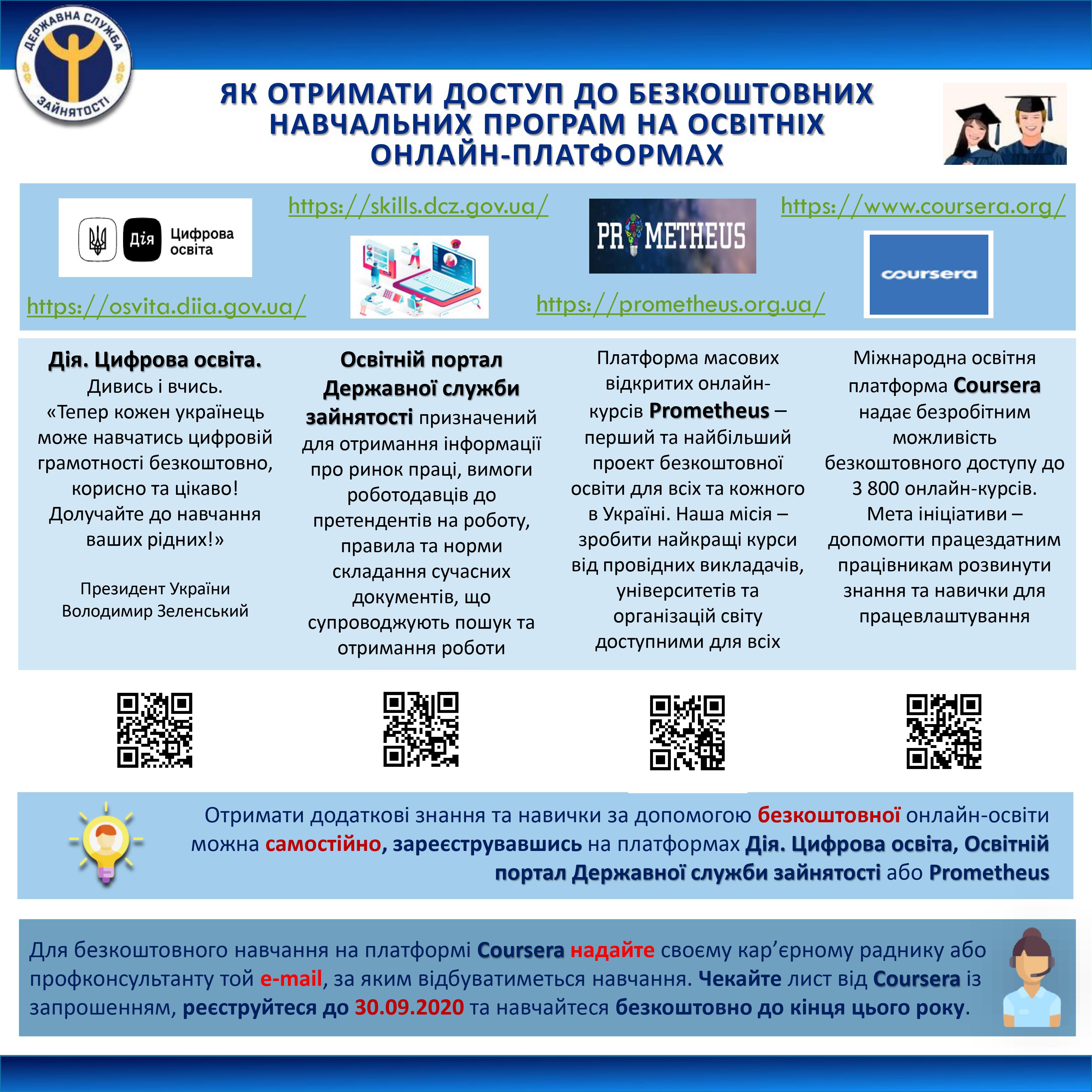 Міжнародна платформа Coursera відкрила через служби зайнятості безкоштовний доступ до своїх освітніх програм для безробітних (3800 онлайн-курсів за вибором). Мета ініціативи – допомогти працездатним працівникам розвинути додаткові знання та навички для працевлаштування.