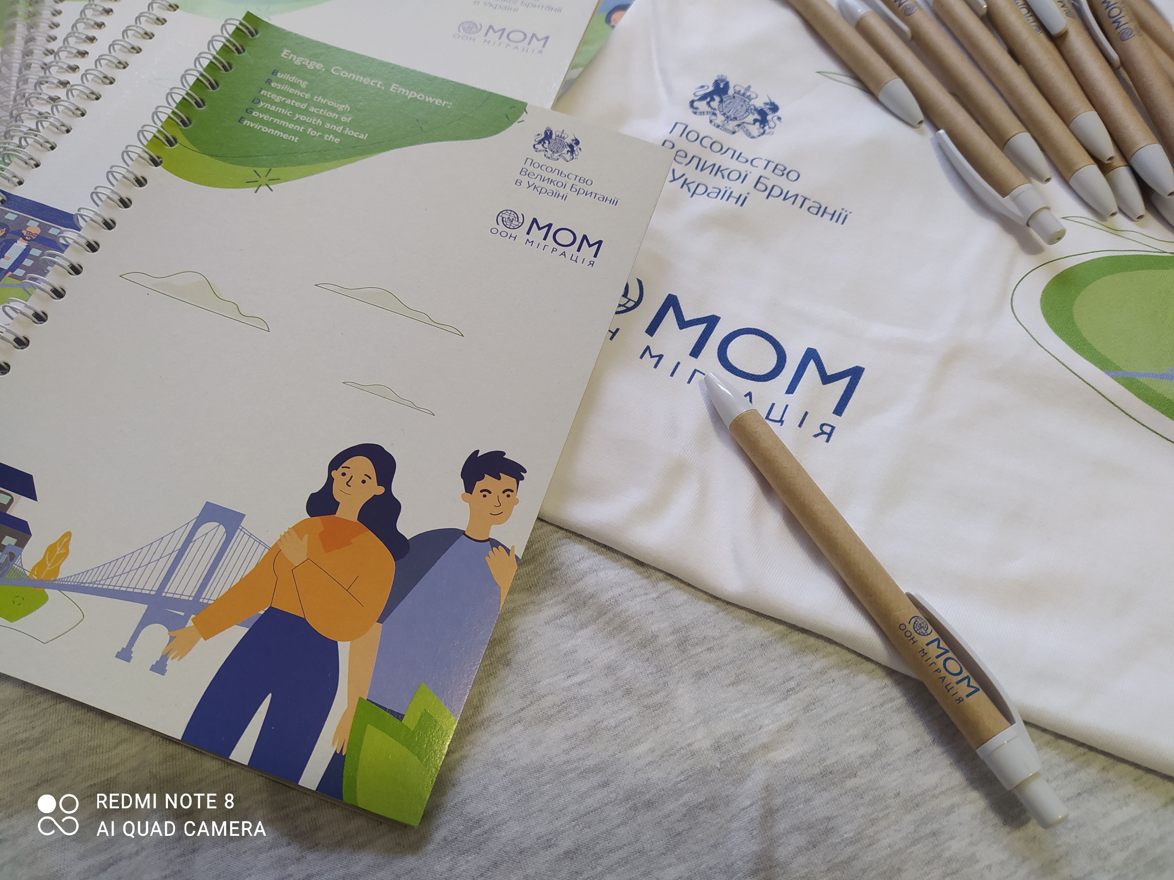 У ході співпраці молодіжної ініціативної групи Баштанської територіальної громади та Міжнародної організації з міграції (МОМ) в Україні у рамках проєкту «Долучайся, взаємодій, створюй: активна молодь та місцева влада на захисті довкілля» учасники ініціативної групи, що впроваджують проєкт «Екологічне перезавантаження» у нашій громаді, отримали подарунок у вигляді ручок, футболок та блокнотів.